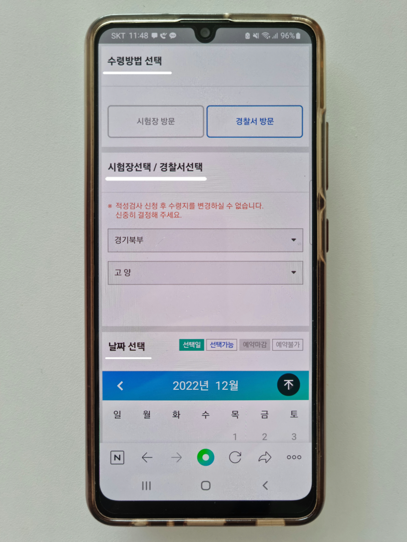 다음은 면허증 종류와 수령지, 방문 가능 날짜 선택입니다.